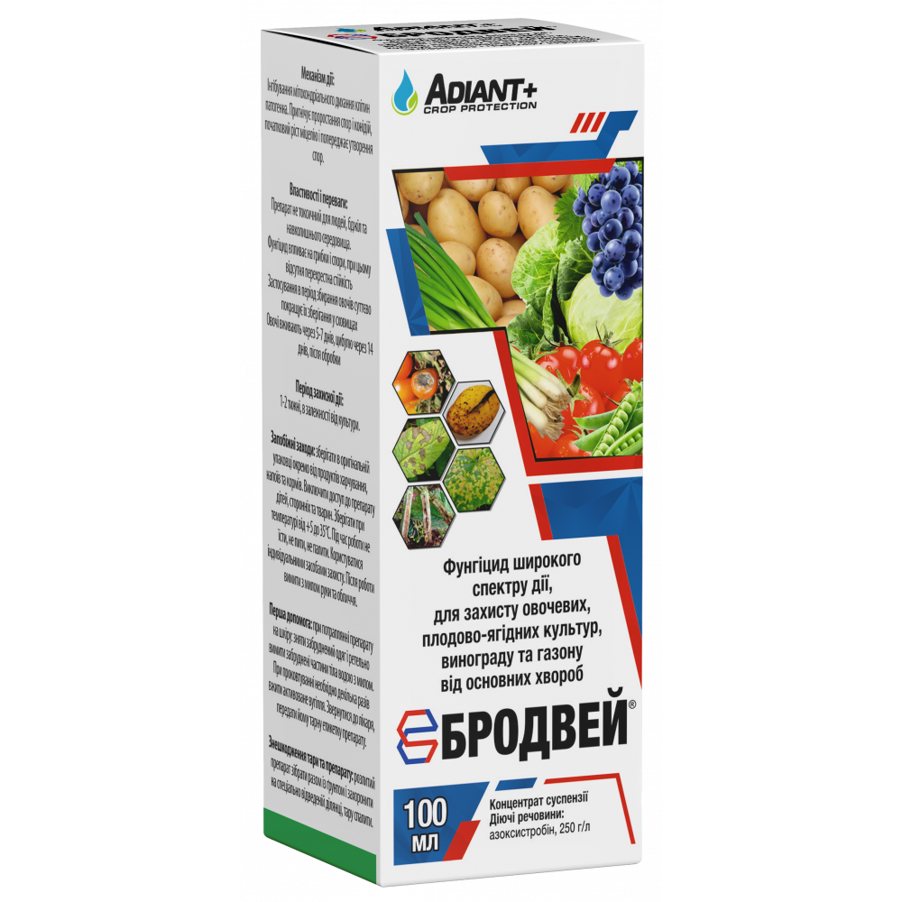 Бродвей - високоефективний фунгіцид із захисною, лікувальною та викорінюючою дією для боротьби із широким спектром хвороб сільськогосподарських рослин. Препарат відмінно контролює гриби із класу Аскоміцети, Базидіоміцети, Дейтероміцети та Ооміцети. Володіє системно-контактною та трансламінарною дією. Не викликає резистентності в патогенів. Період захисної дії - 1-2 тижні, залежно від культури, інфекційного навантаження, погодних умов та використаної в господарстві агротехніки. Бродвей має профілактичну, лікувальну та антиспорулянтну дію. Пригнічує проростання конідій на поверхні листя. Забезпечує загибель міцелію патогену вередині листа, а також перешкоджає утворенню спор патогену. Норма витрати фунгіциду - 0,6-0,8 л/га.