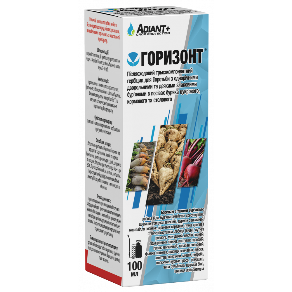 Горизонт - селективний трьохкомпонентний гербіцид із грунтовою дією. Використовується у післясходовий період для боротьби із однорічними дводольними та деякими злаковими бур`янами у посівах цукрових, кормових та столових буряків. Успішно контролює такі важкознищувані види бур`янів, як лобода біла, бур`яни родини Хрестоцвітих, щириця, гірчак (види) та ін. Видимі симптоми дії препарату проявляються через 3-4 доби після обробки. Повна загибель шкодочинної рослинності настає через 7-10 діб. Горизонт містить у своєму складі ПАР, які дозволяют краще покривати та довше утримуватися на листовій пластинці бур`янів. Найефективнішим способом використання препарату є триразова обробка із нормою витрати 1 л/га (за одну обробку). При цьому стадія розвитку буряків не має значення.