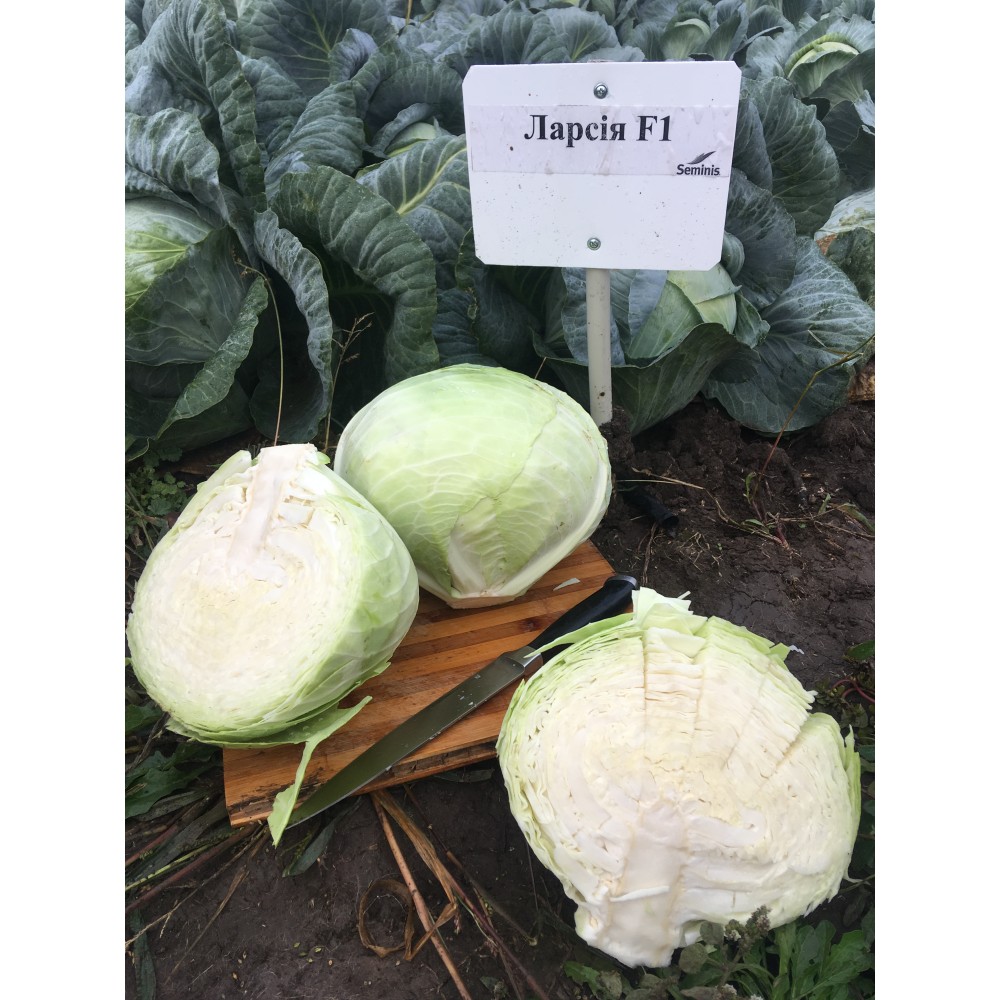 Ларсія F1 – середньопізній високоврожайний гібрид білоголової капусти. Тривалість вегетаційного періоду 115-120 днів. Рослина має середню силу росту. Головки плоскоокруглої форми, із коротким качаном та великою кількістю внутрішніх листків. Середня маса 5-7 кг. Гібрид вирізняється відмінними товарними якостями та високим вмістом сухих речовин.