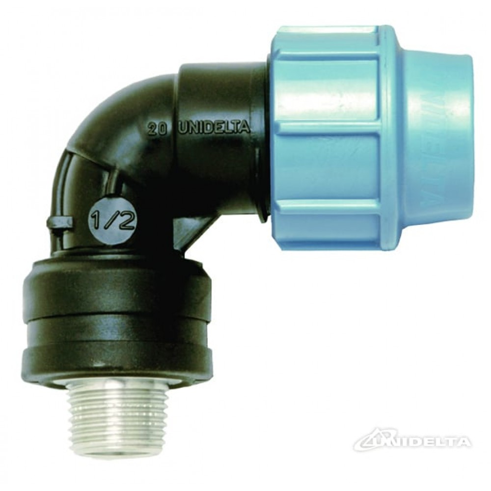 Коліно компресійне з метал. зовнішньою різьбою Unidelta. Максимальний тиск – 16 бар. Температура – до 60С.