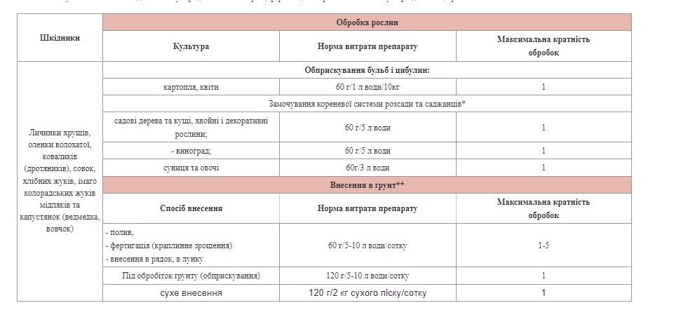 Захист рослин від ґрунтових шкідників, а саме: імаго та личинок травневого хруща, оленки волохатої, вовчка звичайного, коваликів, гусені совки тощо.