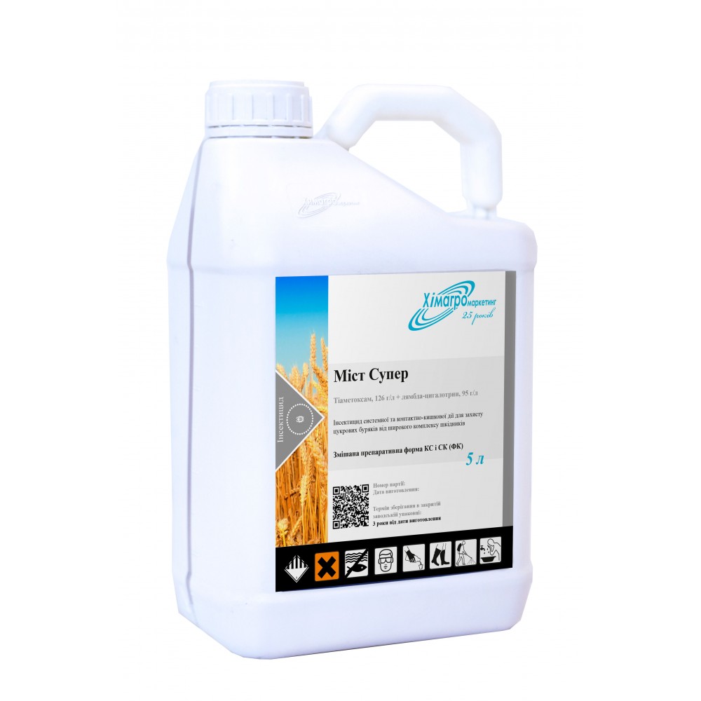 Міст Супер - інсектицид контактно-кишкової дії для захисту посівів цукрових буряків від широкого спектру шкідників. Препаративна форма - концентрат мікрокапсульованої суспензії - значно подовжує дію піретроїдного складника препарату і покращує термостабільність, фотостабільність та стійкість інсектициду до опадів. Міст Супер поєднує потужний нокдаун-ефект та тривалий період захисту рослини зсередини. Препарат ефективний проти хлібного туруна та прихованоживучих шкідників, незалежно від погодних умов. Завдяки високій проникаючій здатності, частина інсектициду проникає в грунт та впевнено протистоїть грунтовим шкідникам. Комбінація двох діючих речовин із принципово різними механізмами дії унеможливлює прояви резистентності. Норма витрати препарату - 0,18 л/га.