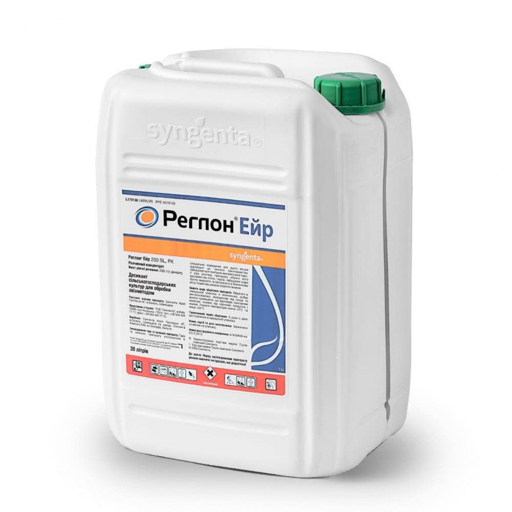 Дієвість Реглон Ейр 200 SL Сингента забезпечує речовина дикват у співвідношенні 200 г/л. Клітини рослини швидко її поглинають, після чого відбувається порушення процесу фотосинтезу, а також утворюються супероксиди, що руйнують клітини рослин. Рекомендовано проводити обробку авіа. Якщо площі великі, можна проводити обприскування з гелікоптерів, але слід унеможливити потрапляння речовини на інші культури. Розчин використовують протягом 24 годин.