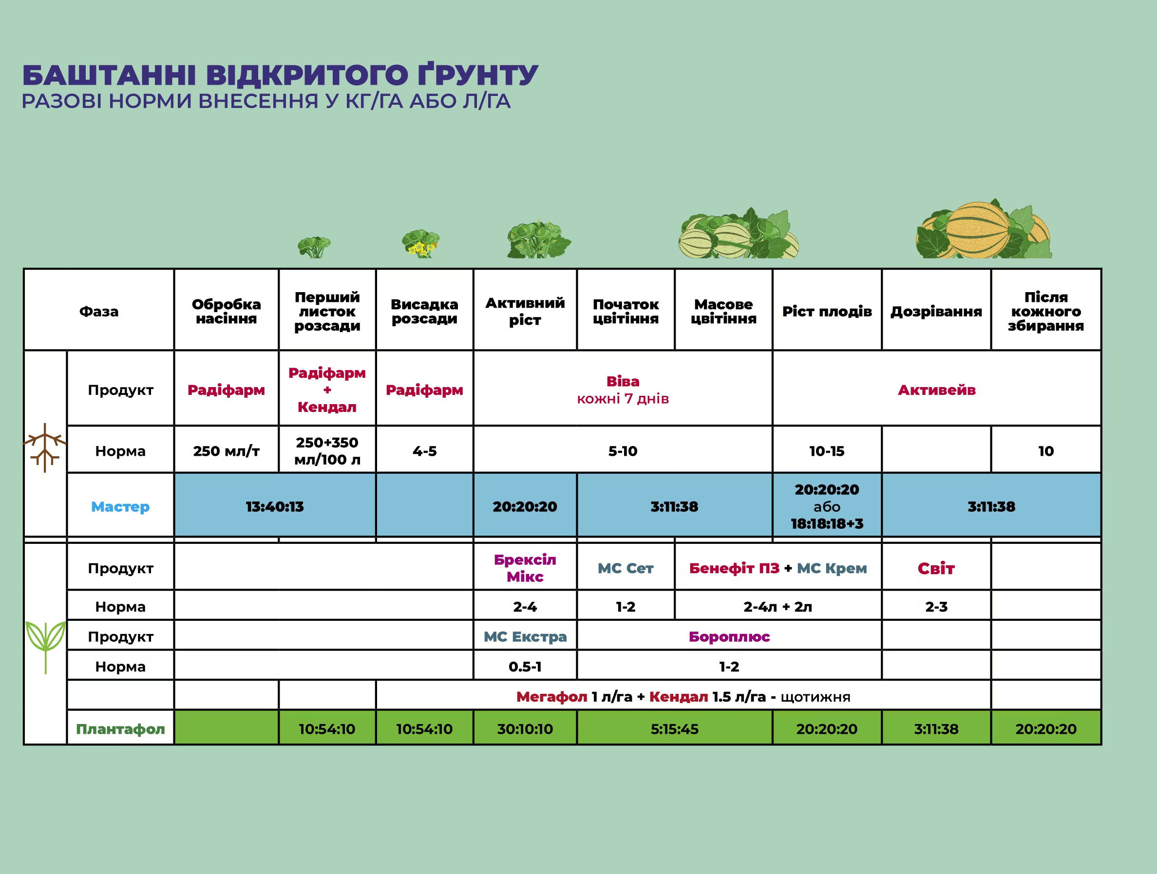 Важно: Все нормы внесения указаны в кг/га или л/га. Для достижения максимального эффекта рекомендуется соблюдать очередность фаз, указанных на графике.