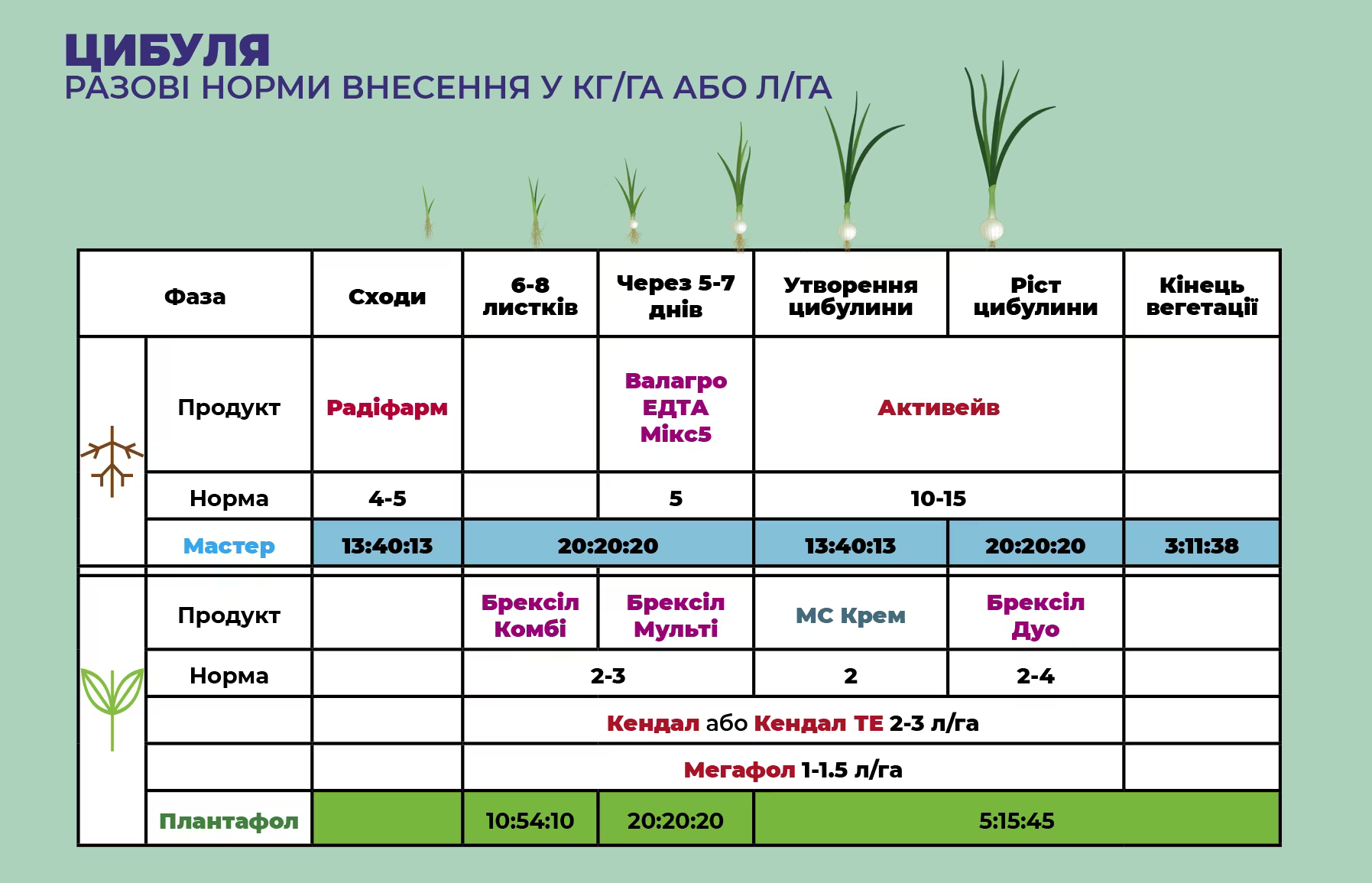 - Плантафол 5:15:45: Финальная калийная подкормка по листу для ускорения «оттока» питательных веществ из пера в луковицу.