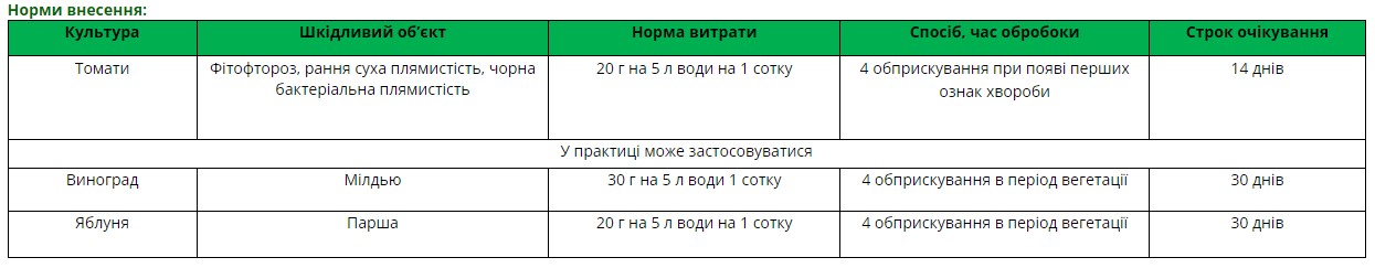 Незамінний профілактичний препарат з лікувальним ефектом. Поєднує дві діючі речовини з різних хімічних класів. Використовується протфгом періоду вегетації до фази достигання плодів.