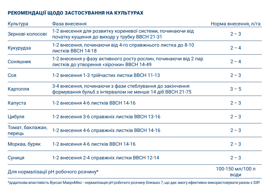 Вуксал МакроМікс - комплексна листкова суспензія зі збалансованим вмістом NPK та мікроелементів. Співвідношення елементів живлення відповідає фізіологічним потребам більшості сільськогосподарських культур.